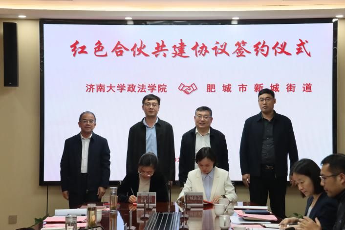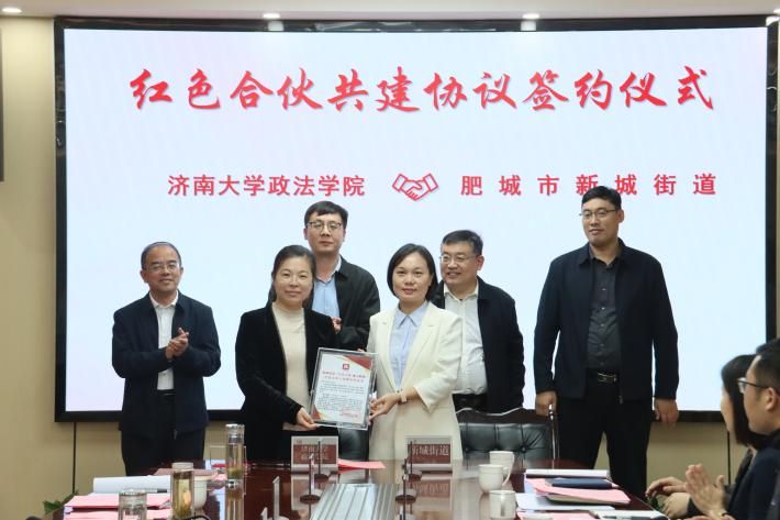 签约仪式阶段,朱丽敏副院长代表政法学院与肥城市新城街道签署《红色合伙信用共建项目协议书》,并领取了“‘红色合伙 聚力解题’红色合伙人领题攻坚证书”,为政法学院发挥资源和智识优势助力新城街道破解社区治理难题、创新模式升级奠定了有效基础。