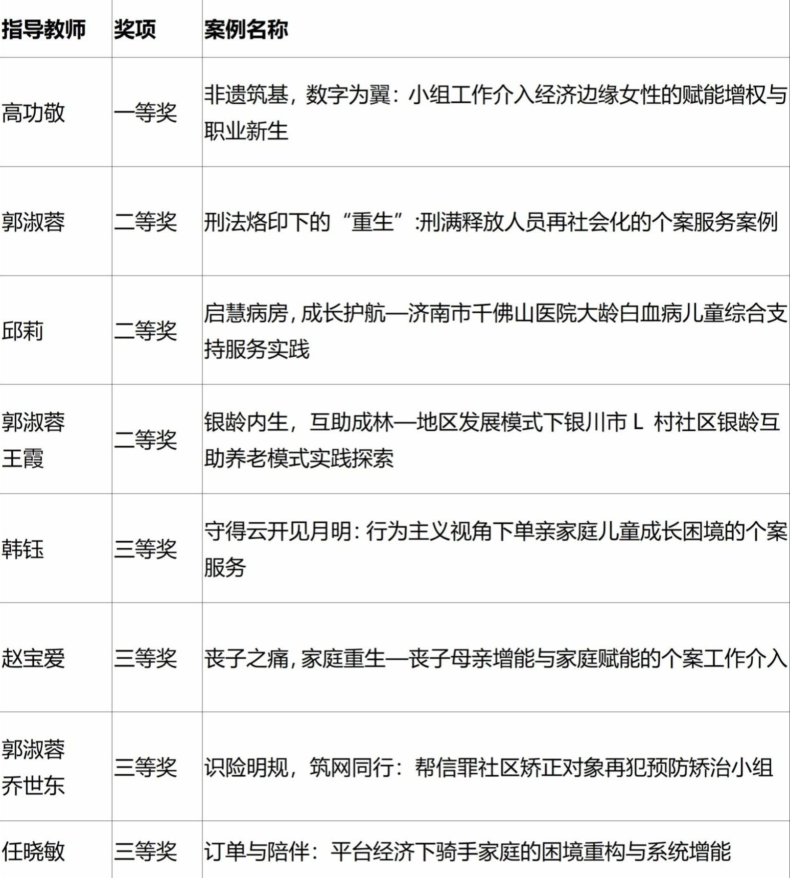 此次赛事成绩的取得,离不开学校与政法学院的大力支持和系统筹备。自大赛筹备以来,学校及学院均高度重视,通过举办“青山杯”社会工作案例大赛遴选优秀作品,并配备专业指导教师团队,从案例选题、文本打磨到现场展示进行全流程指导。其中,高功敬院长指导的《非遗筑基,数字为翼:小组工作介入经济边缘女性的赋能增权与职业新生》案例,因聚焦弱势群体帮扶、融合非遗传承与数字技术创新,凭借鲜明的时代性和扎实的实践成效荣获一等奖。其他团队在本次比赛中亦有出色的表现,我校在此次大赛中的获奖明细如下: