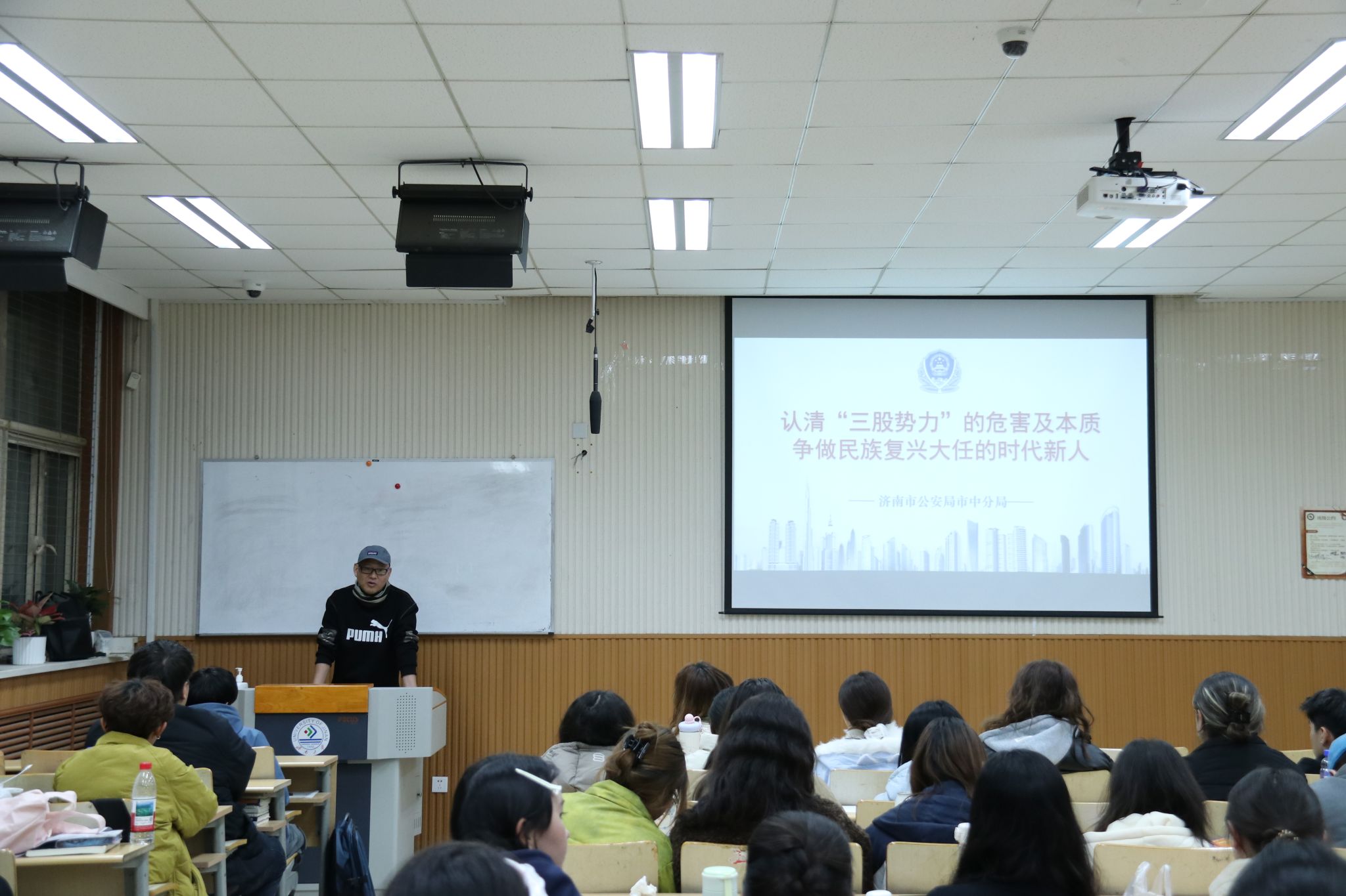 王建国主任围绕“认清‘三股势力’本质”和“加强大学生安全意识”两大主题展开分享。凭借多年奋战在打击暴恐、维护社会稳定一线的实战经验,他以通俗的语言和鲜活的真实案例,深入剖析了“三股势力”的本质特征与现实危害。王主任指出:“‘三股势力’常常披着民族与宗教的‘外衣’,煽动对立、破坏民族团结,最终损害的是全体人民的根本利益。”通过历史事实与现实案例的对比,他有力揭穿了“三股势力”的欺骗性与顽固性,使同学们深刻认识到,维护国家统一和民族团结是每一位公民义不容辞的责任。