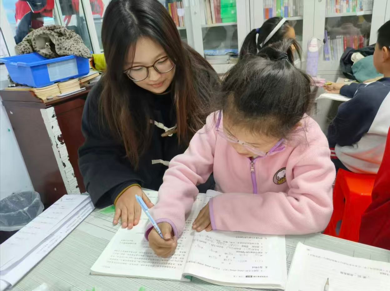 活动伊始,志愿者带着服务的热情走进社区活动室,与孩子们亲切交流,了解他们的学习进度与个性特点。辅导作业时,志愿者注重启发式引导,如作文辅导时以“今日趣事”提问启发思路,鼓励孩子们独立思考、培育自主学习能力。面对难题时,志愿者用通俗方式拆解知识点,解析核心逻辑,有效激发孩子们的求知欲与探索欲。课堂互动上,志愿者引导孩子们踊跃问答,营造活跃学习氛围。课业完成后,志愿者组织折纸、五子棋等趣味互动,既锻炼孩子们的动手与思维能力,又在轻松氛围中拉近彼此距离,深化情感联结。