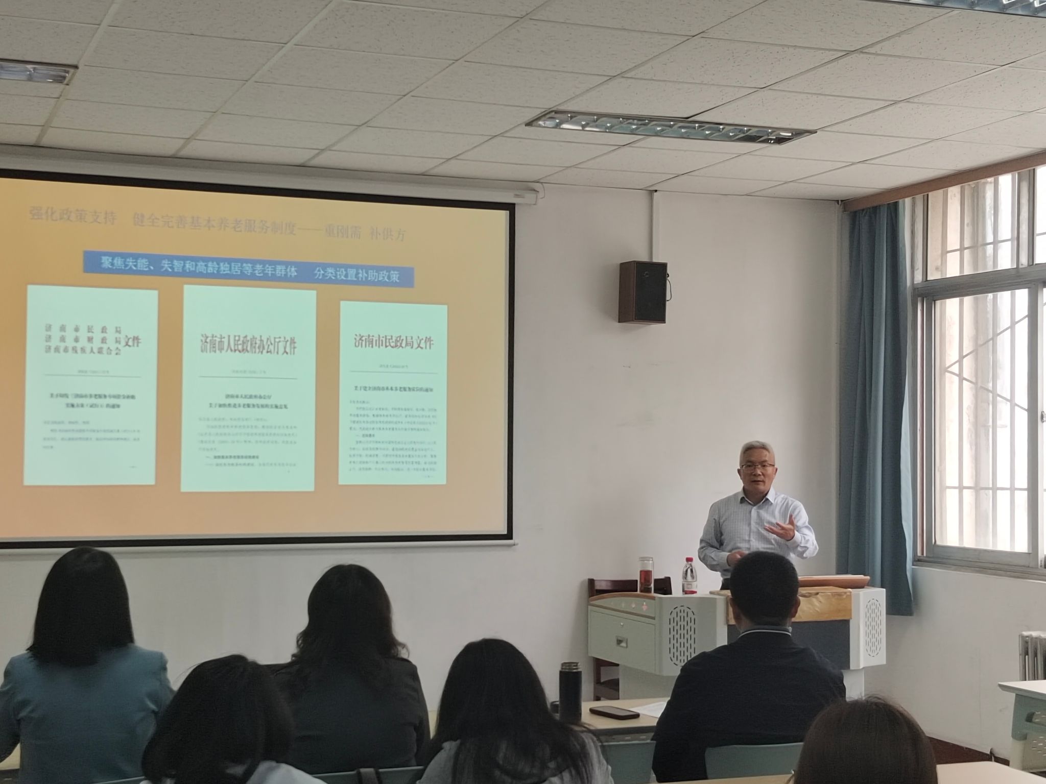 此次讲座的主题是《坚持四个强化 健全完善基本养老服务体系》。孔彬结合自身多年社会福利与养老服务工作经验,从人口老龄化严峻形势切入,通过生动案例与详实数据,系统解读了济南市养老服务体系建设的政策框架与实践成效。围绕养老事业与产业融合发展的核心趋势,详细介绍了济南市在养老服务网络构建、闲置资源改造利用、新建小区配套设施保障等方面的创新举措,以及在资金补贴、人才培养、综合监管等方面的具体实践。针对学生关注的行业痛点与发展机遇,孔彬重点分析了养老服务领域的人才需求结构,强调了专业技能、社会责任感与人文关怀在行业深耕中的重要性,并结合政校社合作模式,为学生提供了实习实践与职业发展的方向指引。