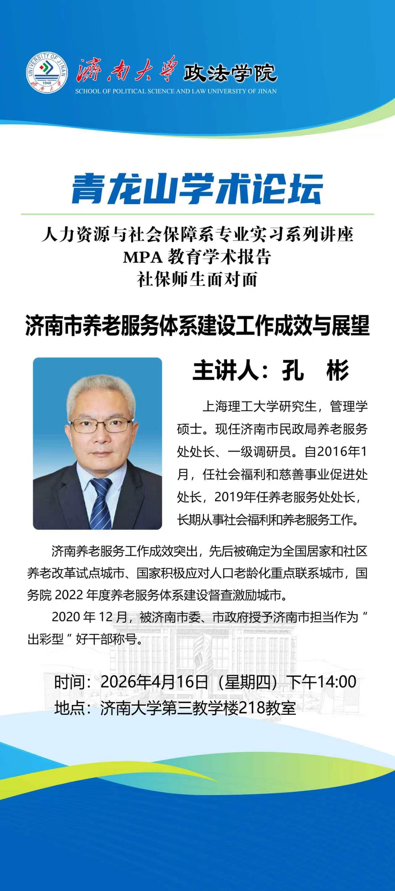 为提升劳动与社会保障专业学生对养老保障、养老服务问题的了解和认识,增强专业认知和专业认同。2026年4月16日,我院人力资源与社会保障系结合认识实习周安排,邀请济南市民政局养老服务处处长、一级调研员孔彬莅临我校为2024级学生开展养老服务专题讲座。