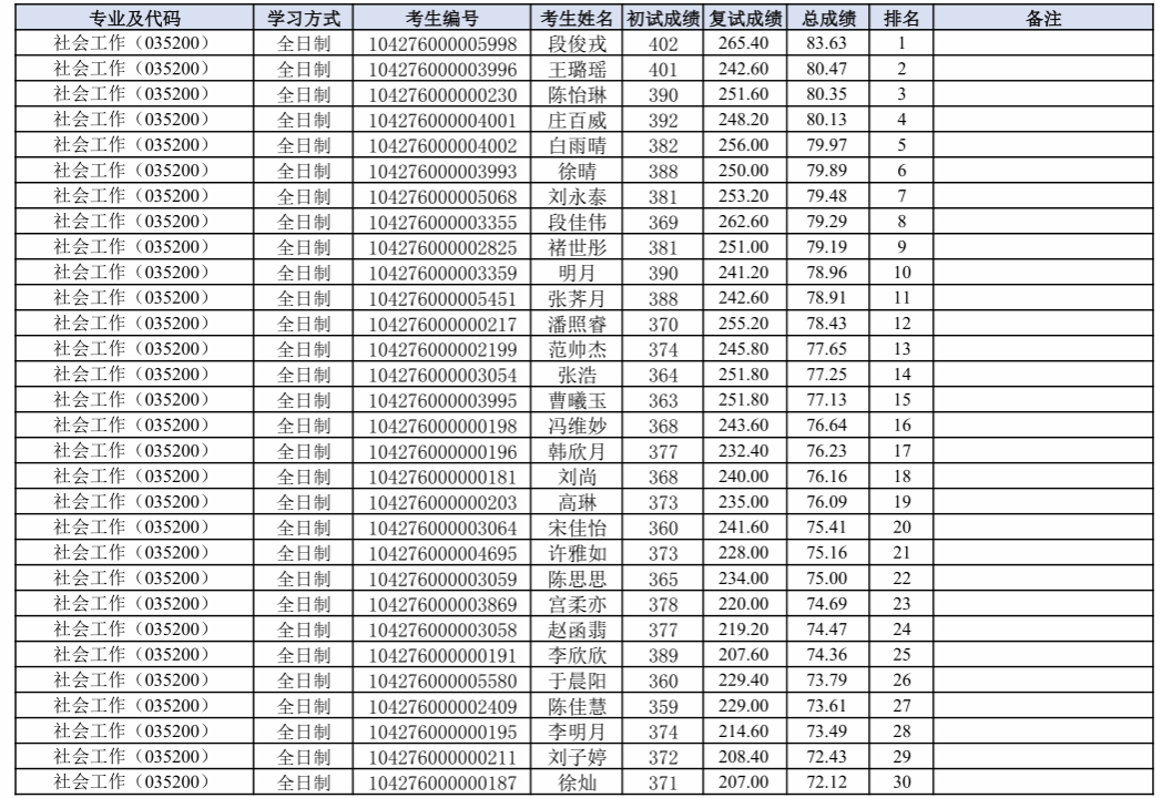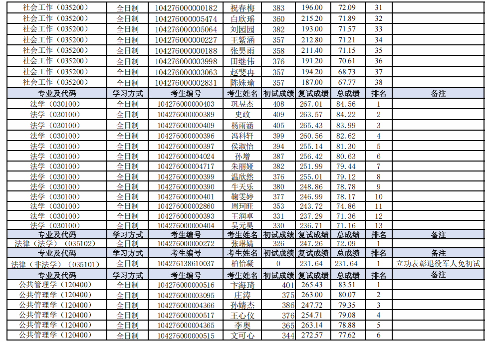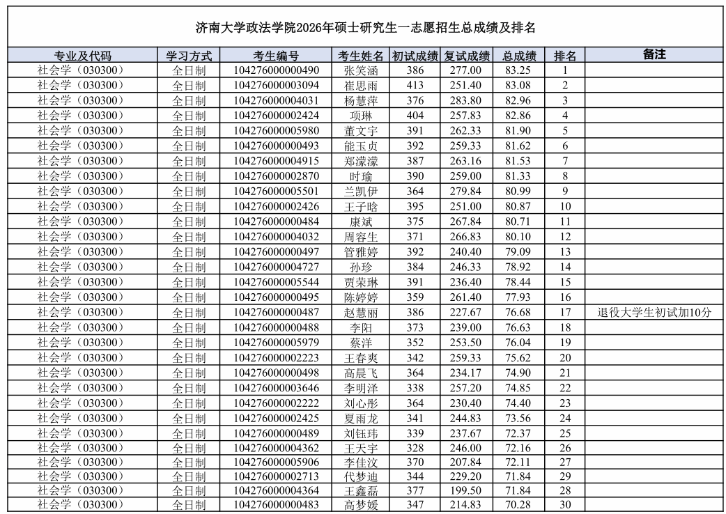 根据《济南大学2026年硕士研究生复试录取工作方案》和《济南大学政法学院2026年硕士研究生复试录取工作方案》的相关要求和部署,学院于2026年3月23日至3月24日进行了社会学(030300)、社会工作(035200)、法学(030100)、法律(法学)(035102)、法律(非法学)(035101)、公共管理学(120400)硕士研究生招生一志愿批次复试工作。现将考生成绩及排名予以公示。