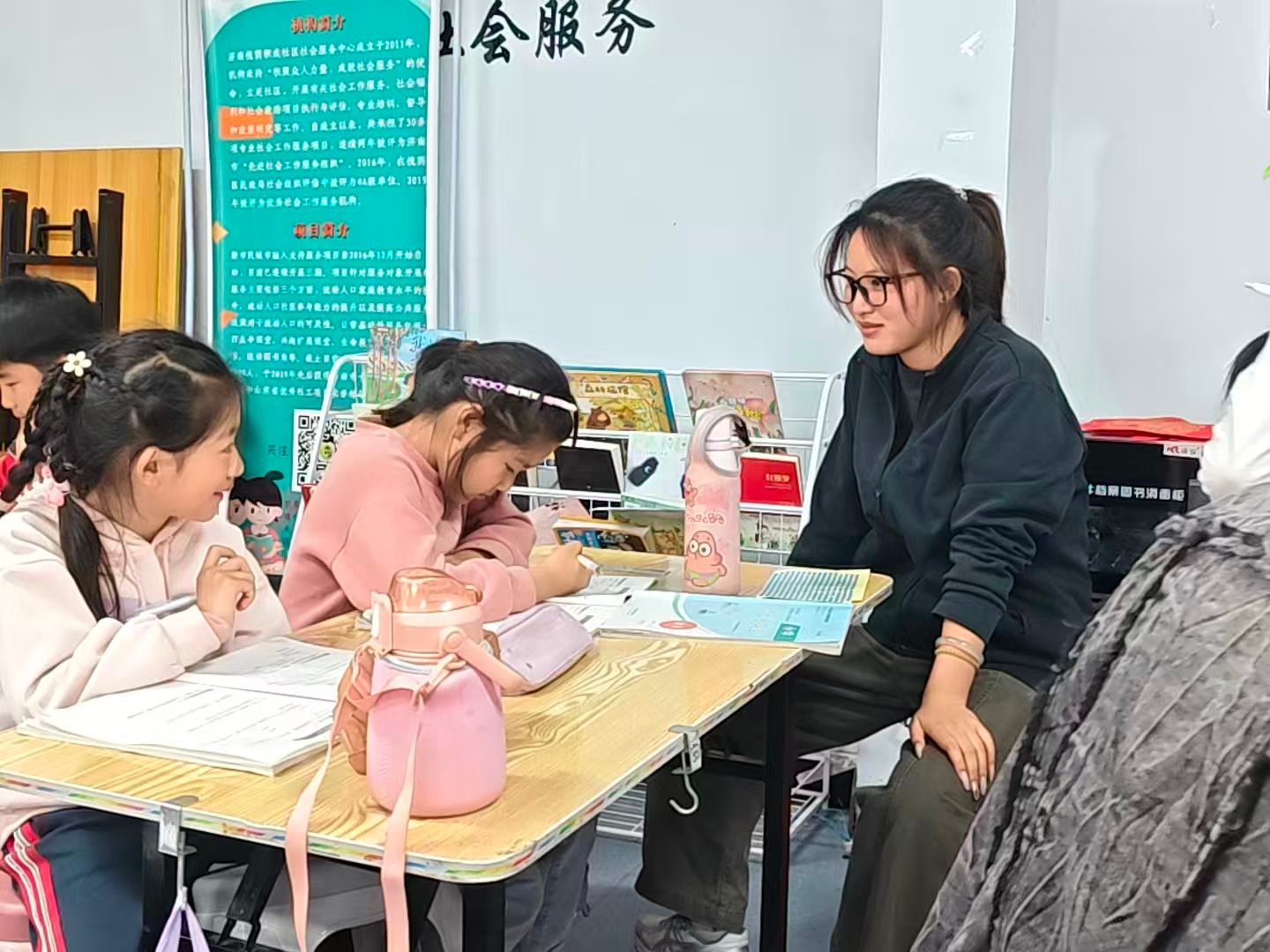 活动筹备期间,志愿者们提前对接社区需求,精心准备课业辅导素材与趣味互动方案,调试教学设备,为活动顺利开展做好充分准备。活动当日,志愿者们准时抵达场地,迅速投入服务:针对课业疑难,用通俗比喻拆解数学难题、阐释成语含义,帮助孩子理解知识、掌握方法;对认真完成作业的学生结合社区积分规则给予奖励,对调皮拖延的孩子耐心提醒,充分调动学习积极性。作业辅导结束后,志愿者们陪伴孩子们开展趣味互动,营造出轻松温暖的活动氛围,青春陪伴与孩童笑脸相映成趣。
