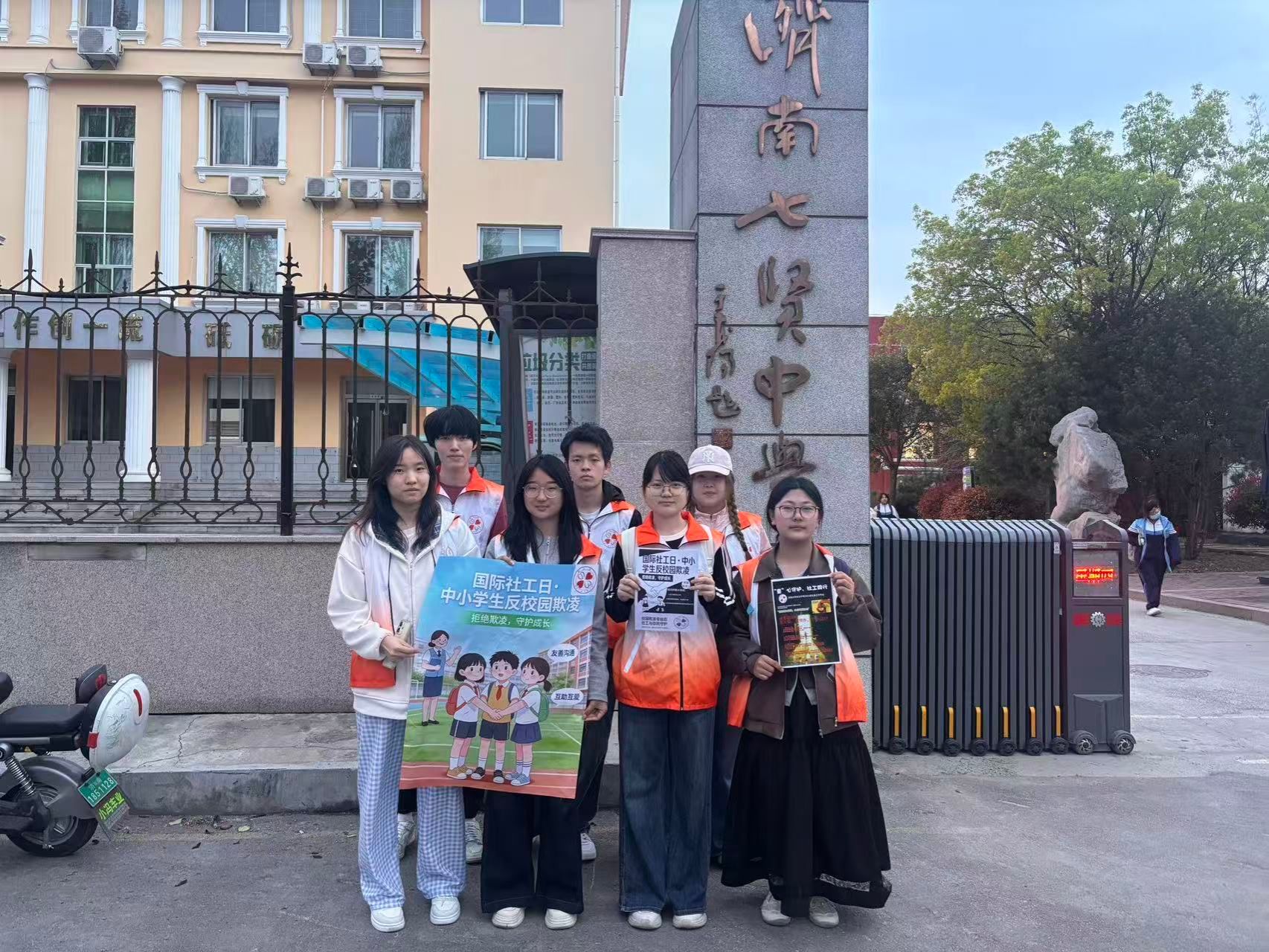 4月2日下午,济南大学社会工作专业2025级本科生在七贤中学门口开展“童心守护,社工同行”国际社工日反校园欺凌主题宣传活动。本次活动在韩钰、范文清两位老师悉心指导下精心筹备,团队提前准备校内宣讲PPT,结合现场实际调整为校外宣传,以传单发放与非结构式访谈相结合的方式,向中学生及家长普及社会工作专业知识,呼吁共同抵制校园欺凌。