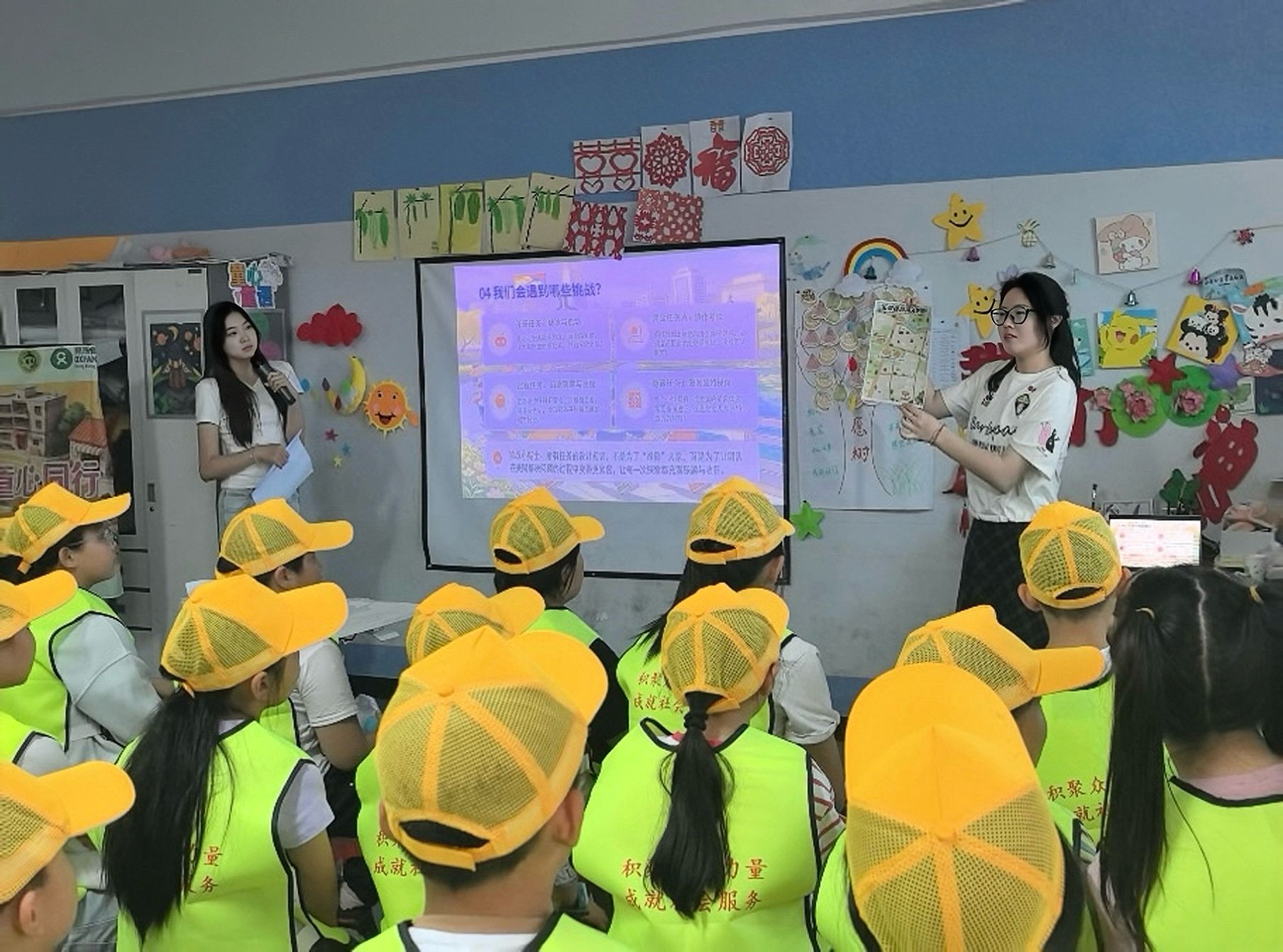 闯关过程中,实习生以“陪伴者”“支持者”身份全程跟进,运用儿童社会工作实务技巧,通过破冰互动帮助儿童消除陌生感;采用引导式提问、鼓励式倾听、优势视角赋能等方式,启发儿童自主观察、团队协作,提升独立思考与问题解决能力。针对内向、参与度不高的儿童,实习生以一对一陪伴、阶梯式鼓励等方式,帮助其建立自信、主动融入。